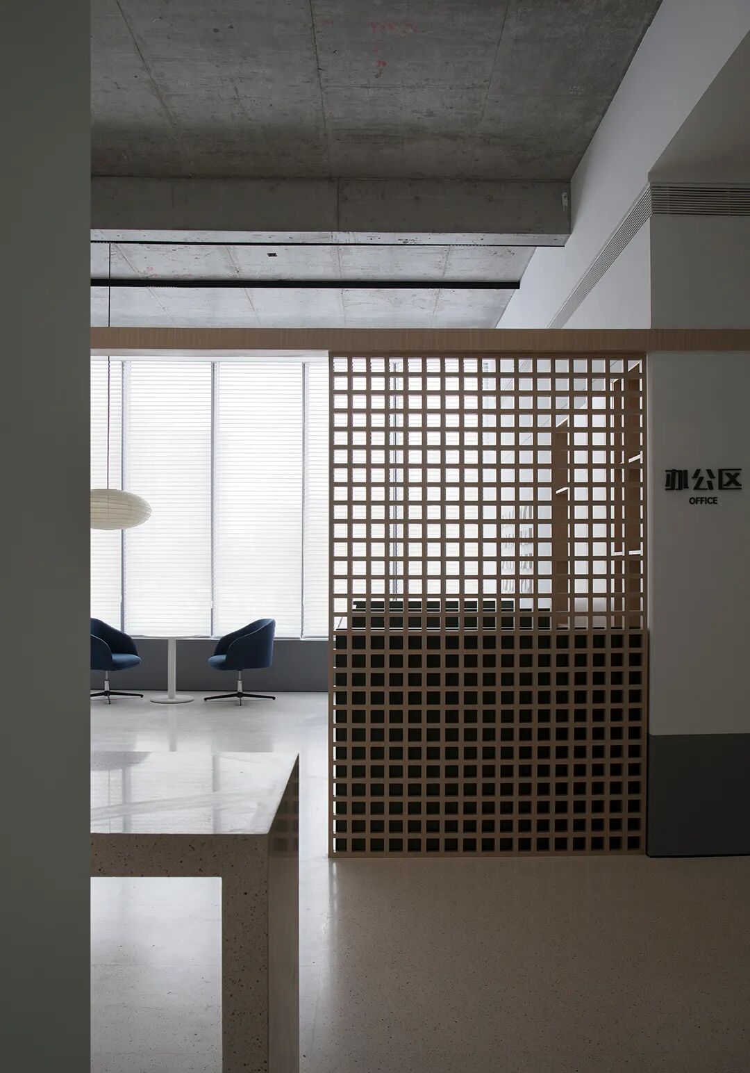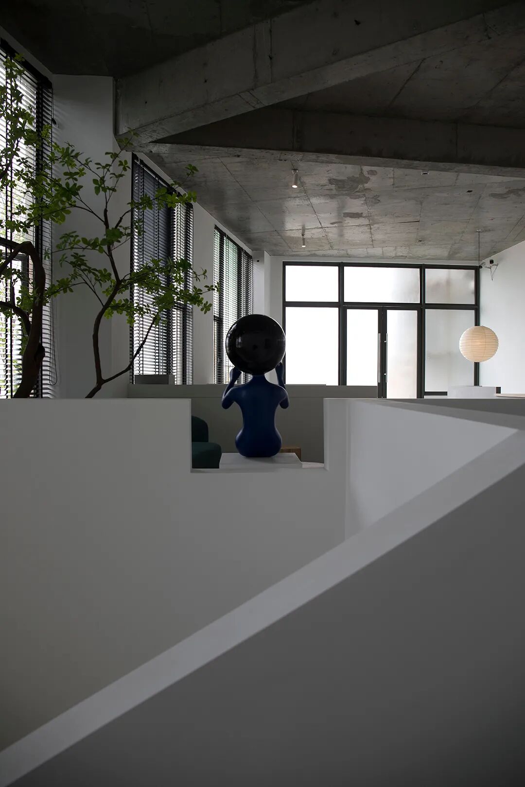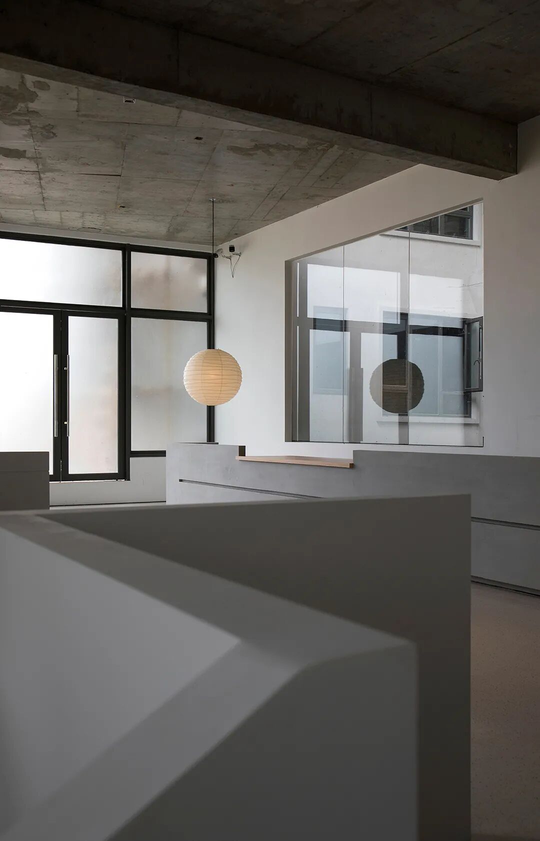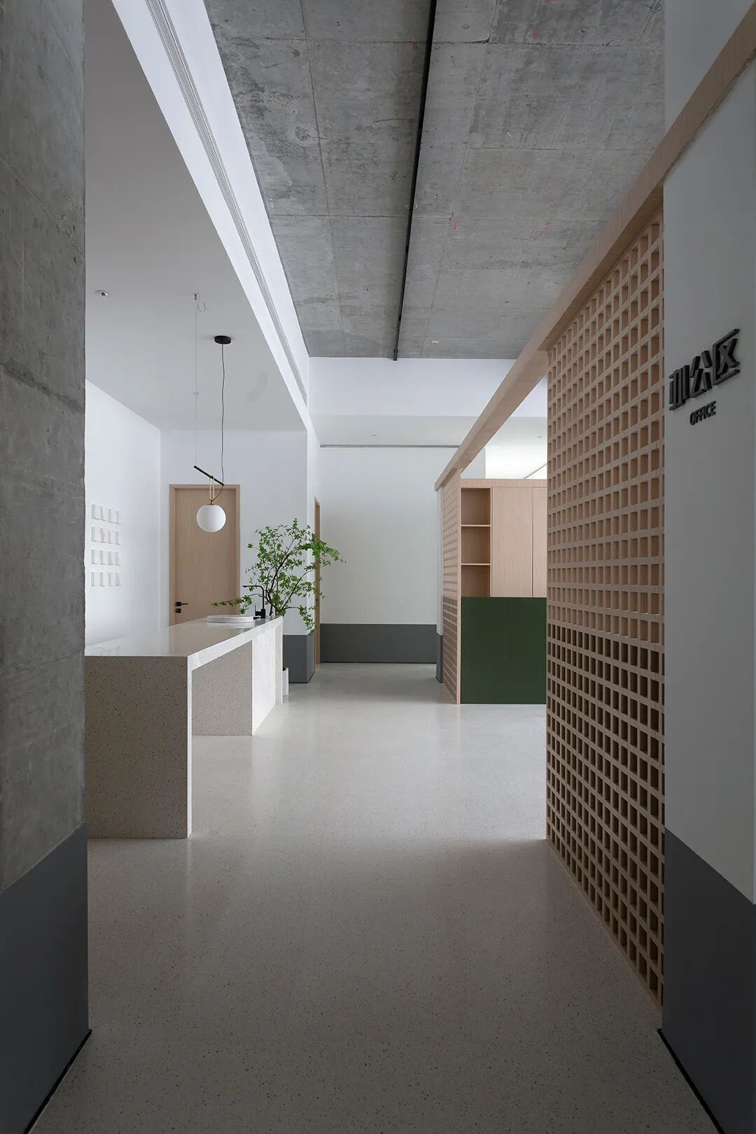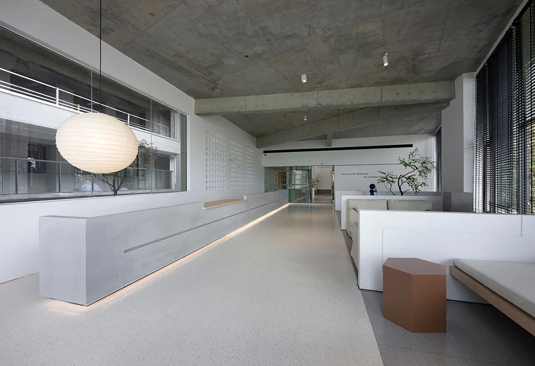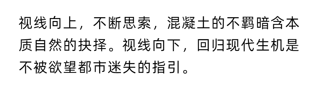 △混凝土的灰与隔墙的白在自然光中和谐过渡
