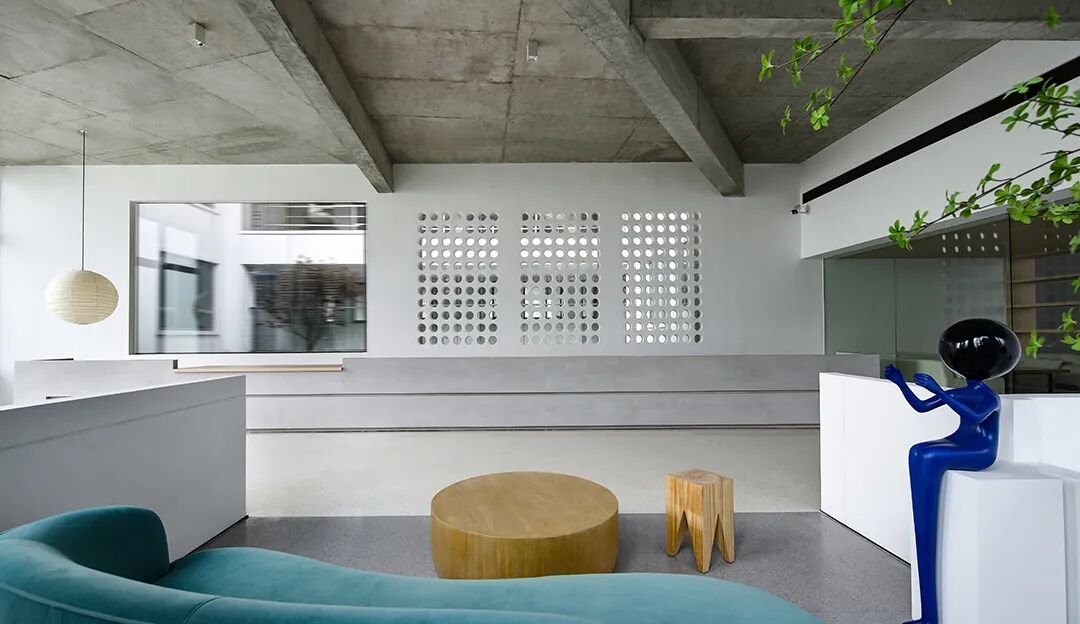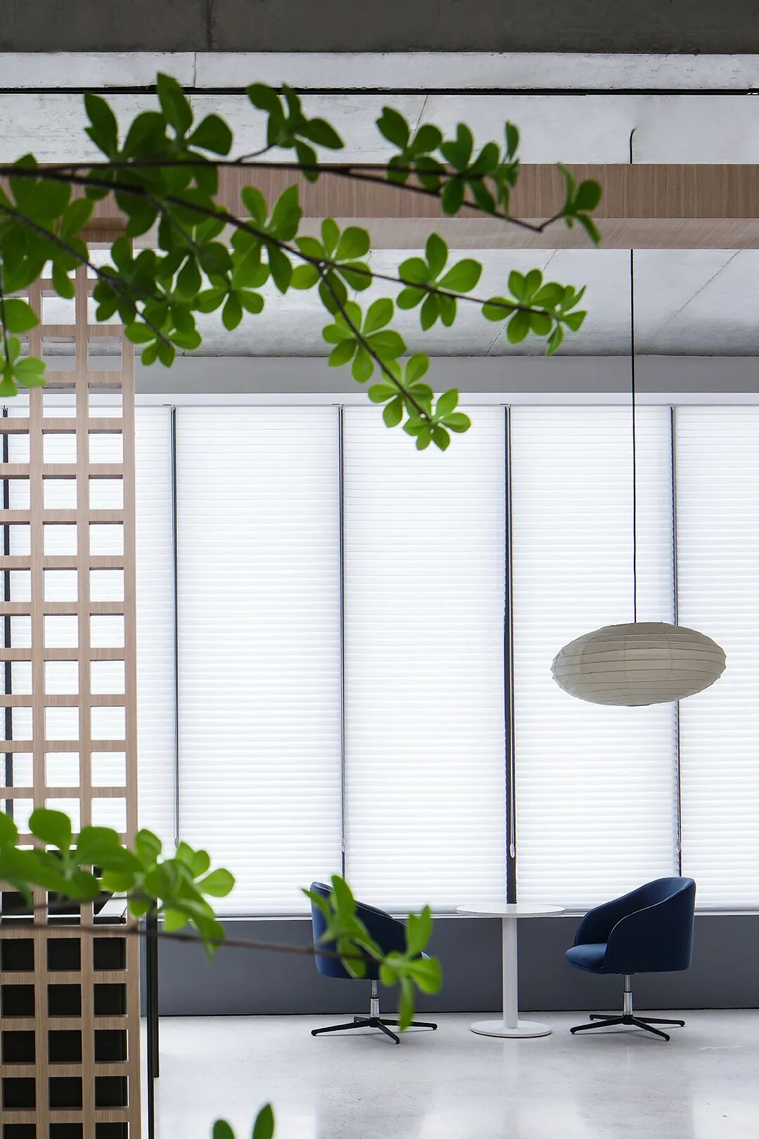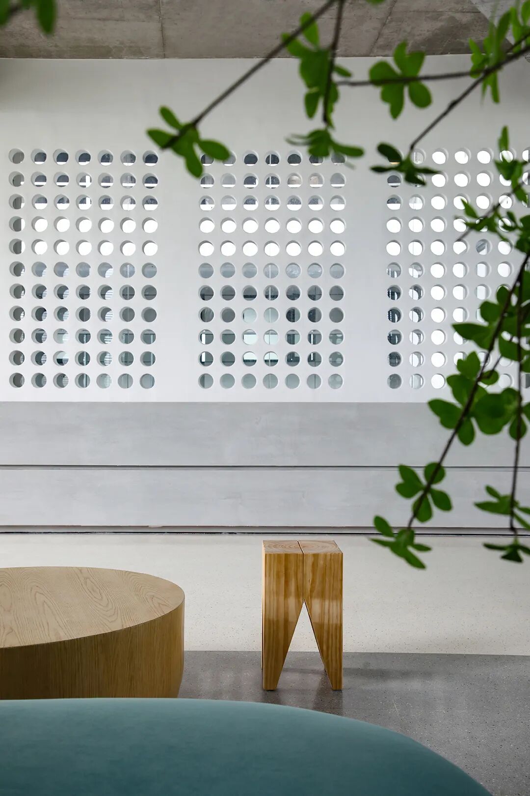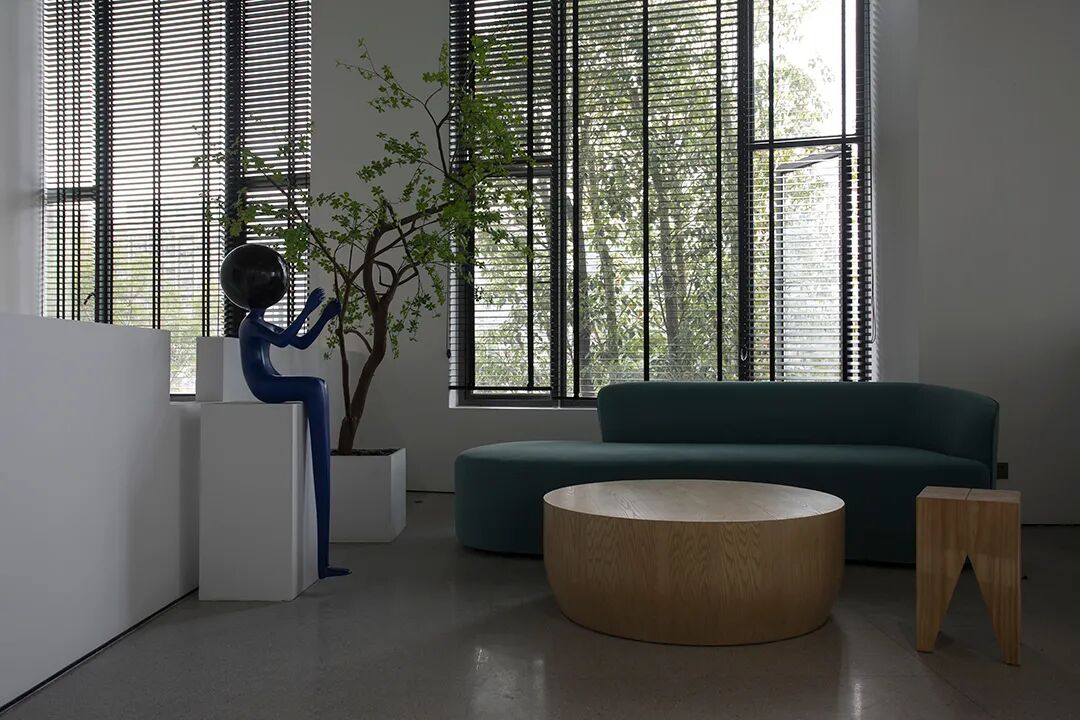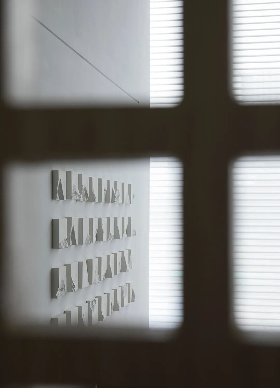 △混凝土的灰与隔墙的白在自然光中和谐过渡
