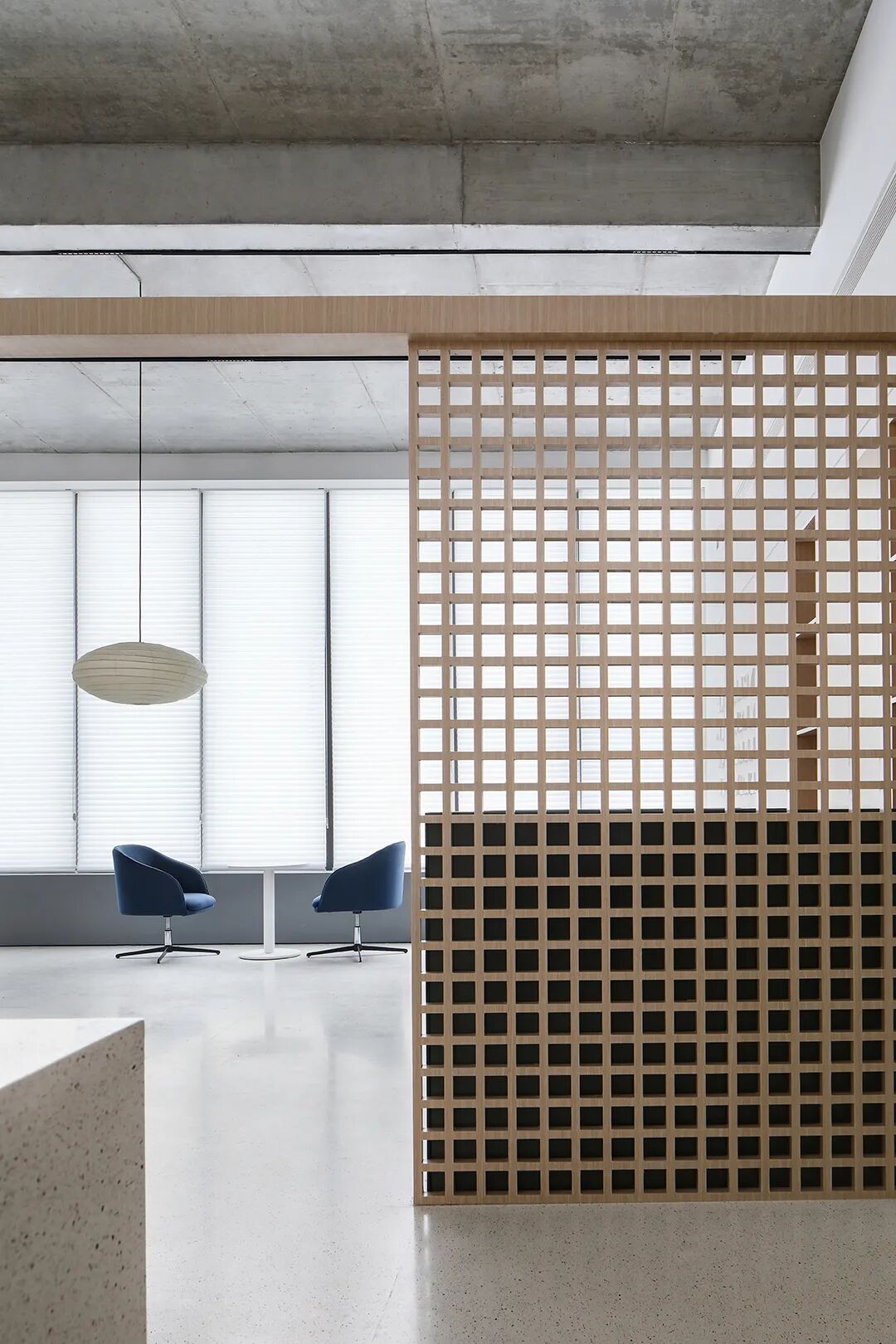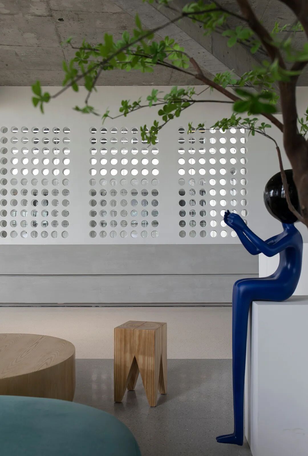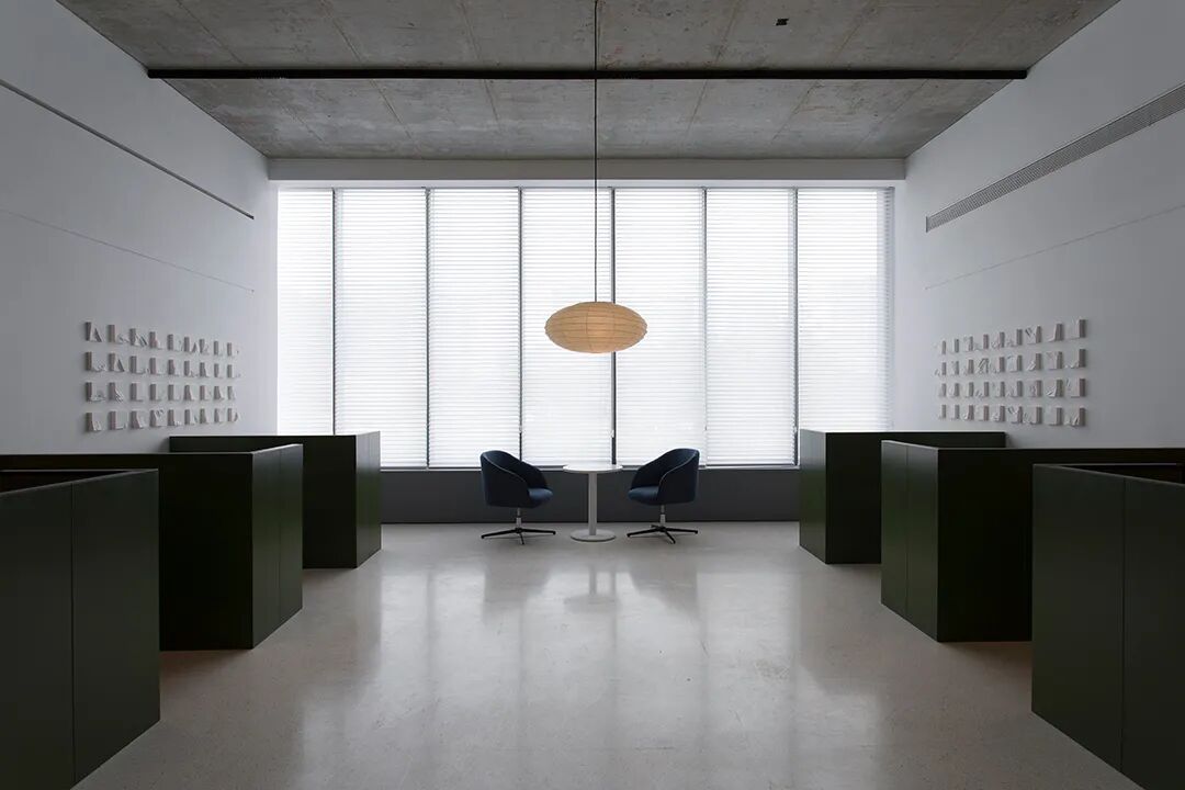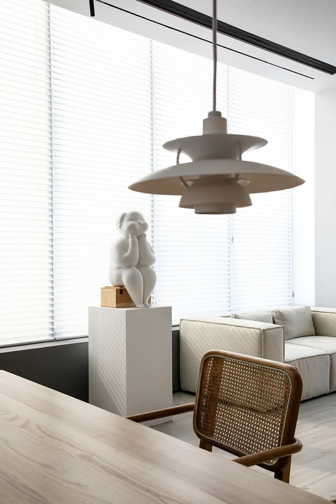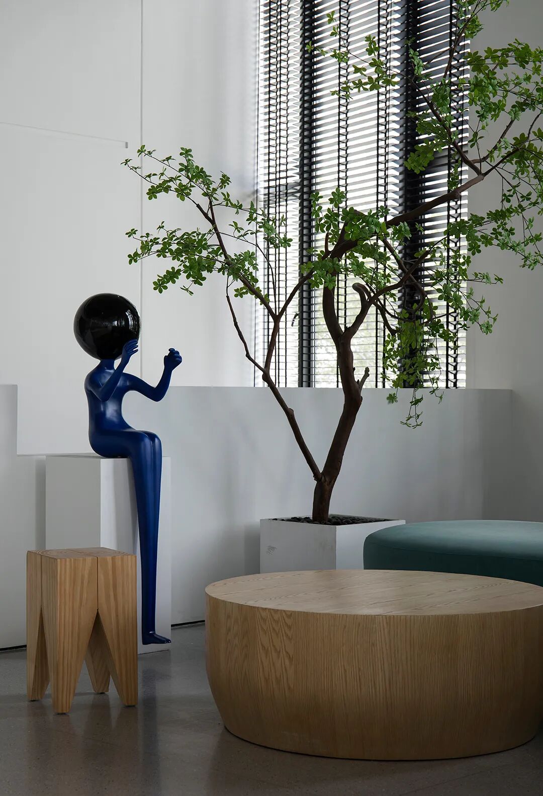 △混凝土的灰与隔墙的白在自然光中和谐过渡