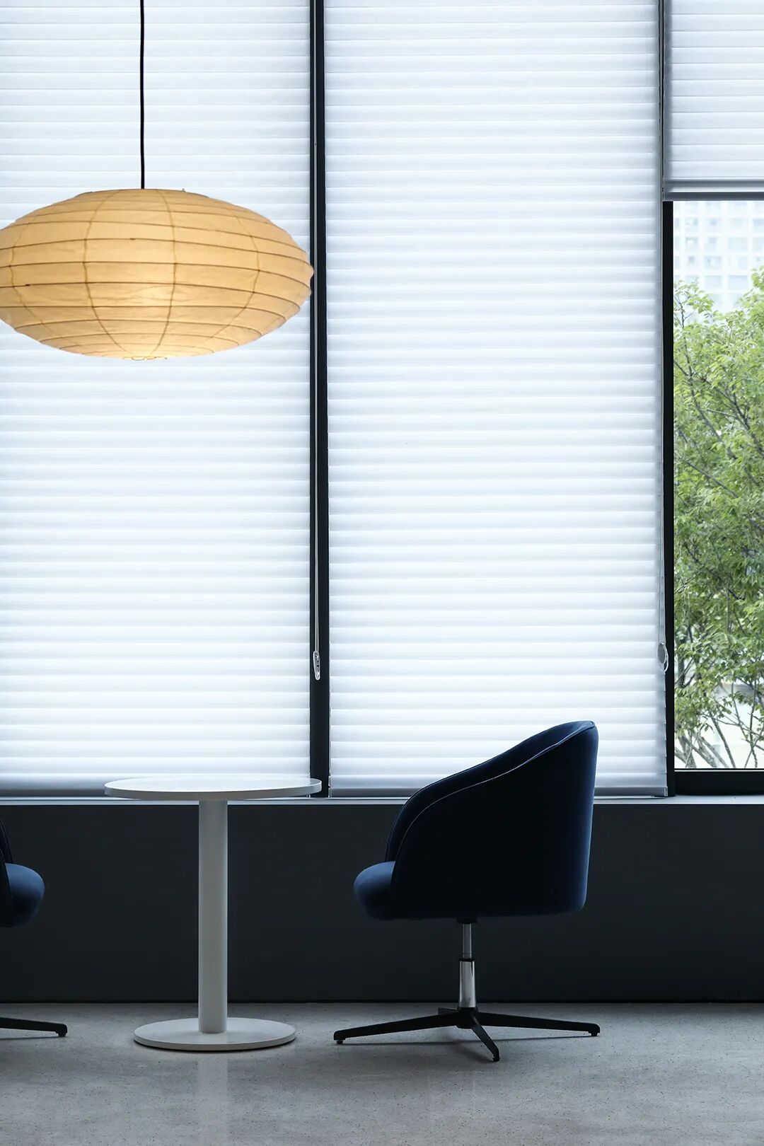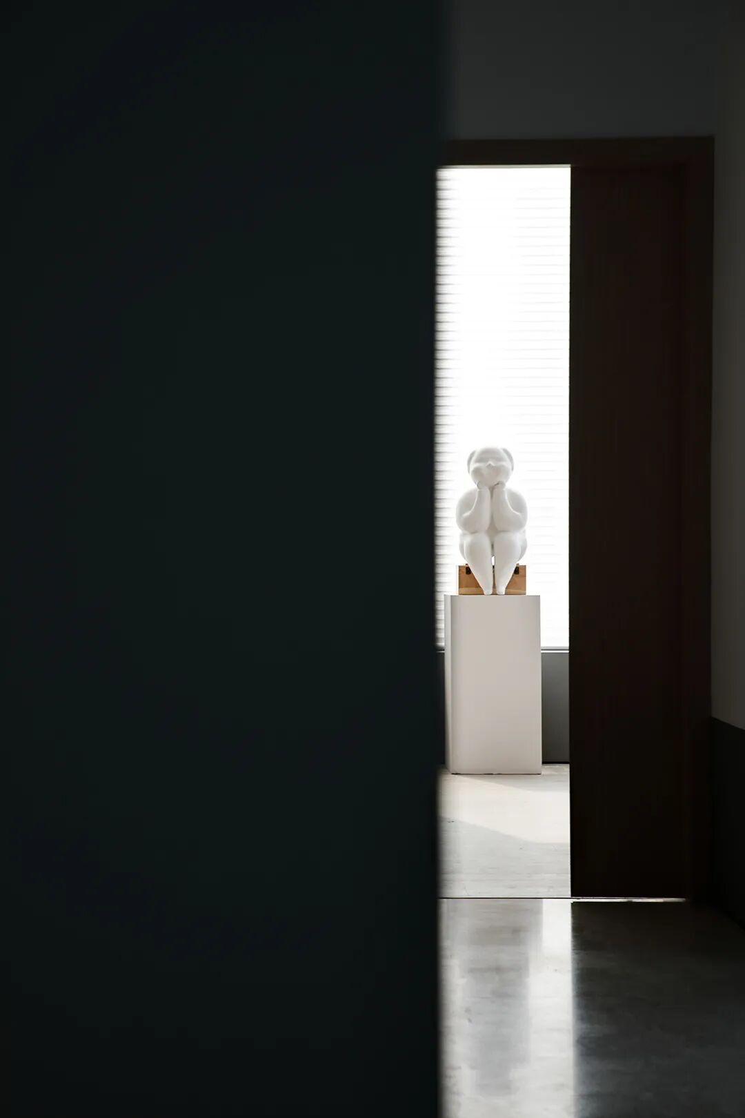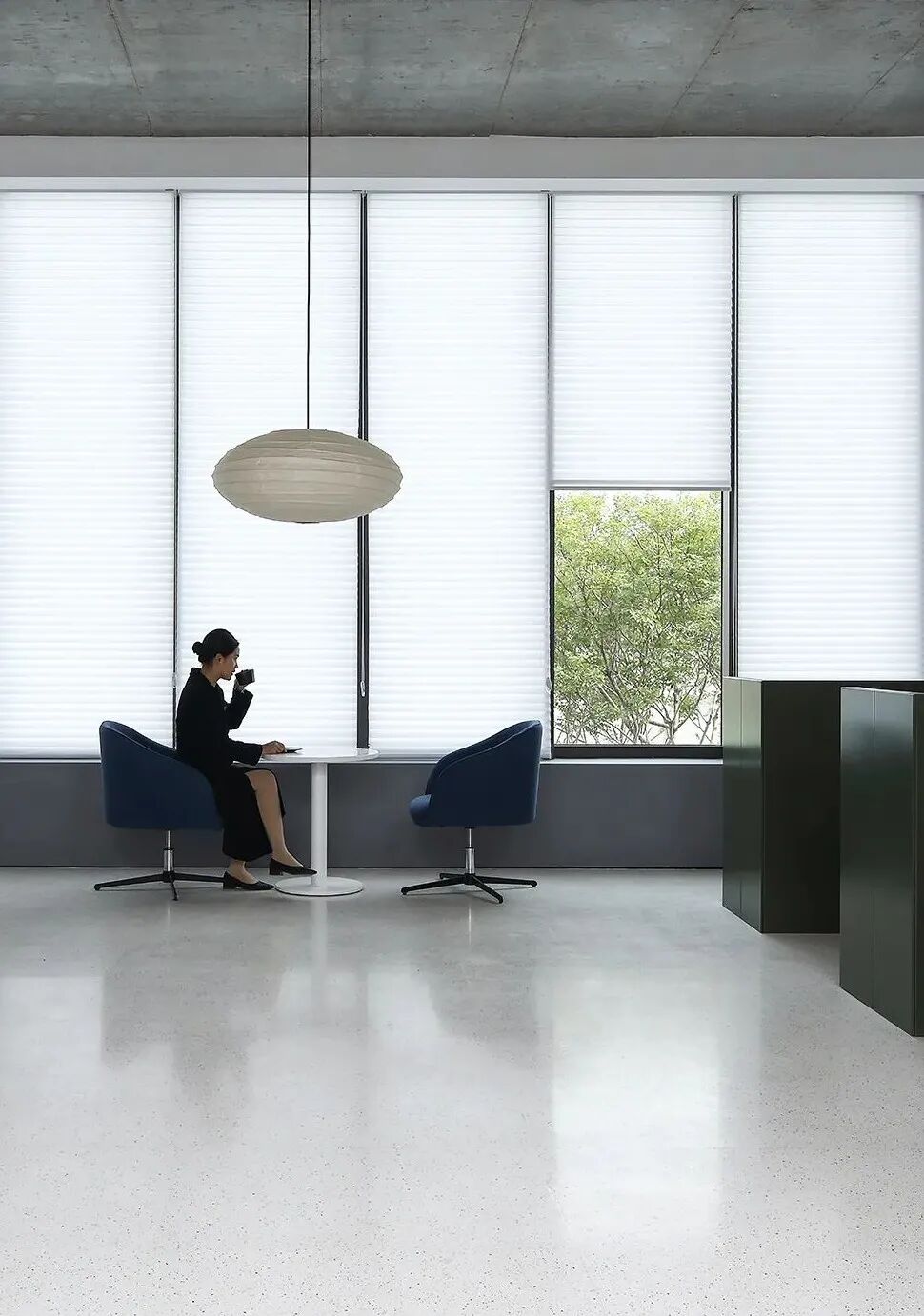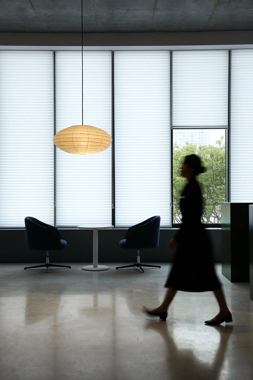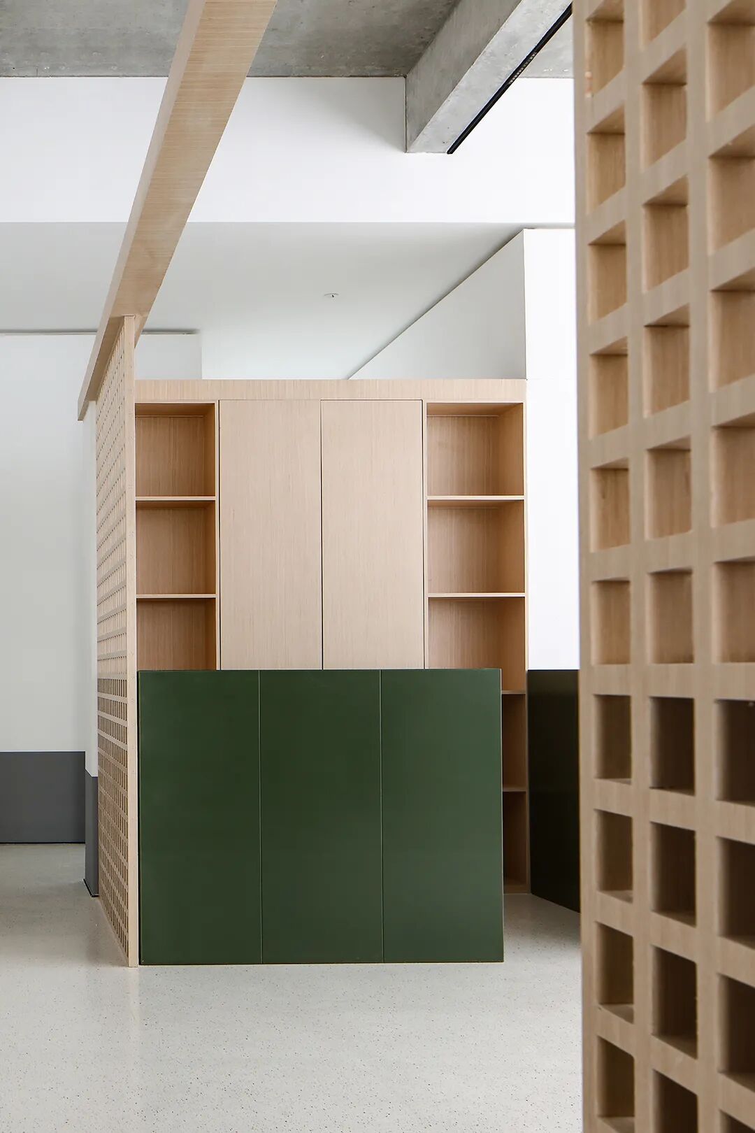 △混凝土的灰与隔墙的白在自然光中和谐过渡