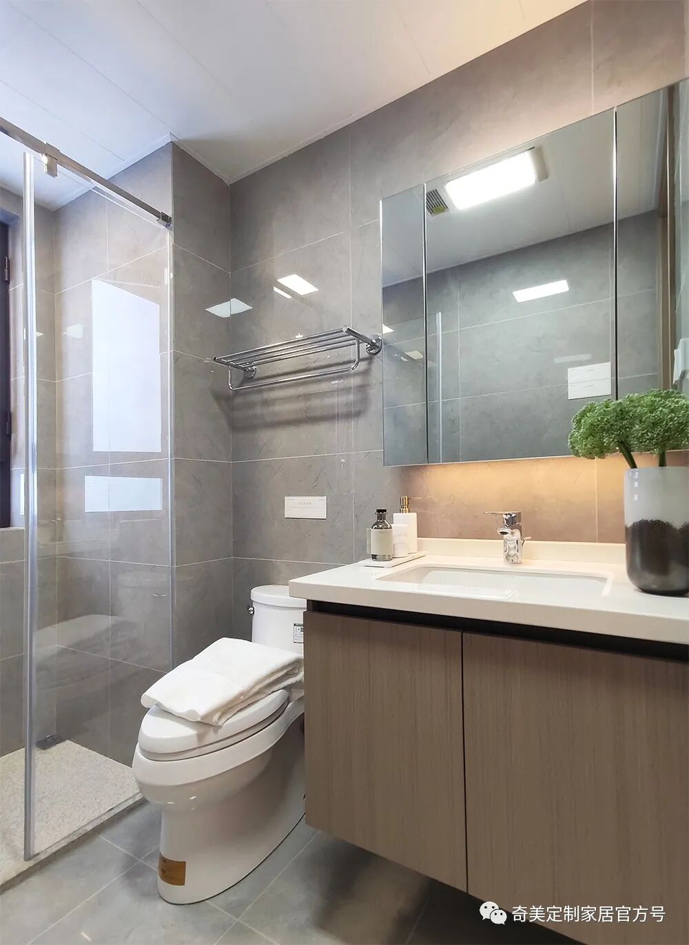 护墙/ 踢脚线采用深色木饰面,门套采用与橱柜同色的PVC配套,达到颜色整体、统一效果。客卫卫浴柜提升了收纳能力,白色台面配合灯光和洗漱镜,让空间更显通透明亮。与地面分离的悬空设计,既可防潮,也便于清理打扫。主卫采用干湿分离的人性化设计。把不同的功能单独隔离出来,不但可以保证浴室的干燥、易清洁和卫生,还能满足多人同时使用的生活场景。作为城市人居环境筑梦者与先行者,奇美致力于实现品质化人居生活。20多年深耕高端定制,专注城市精英人群的生活方式,把握多元限度之内绵密悠长的节奏与韵律,完成设计理念的理性与感性显现,多种高品质生活方式跃然眼前,丰盛的生活热情油然而生。