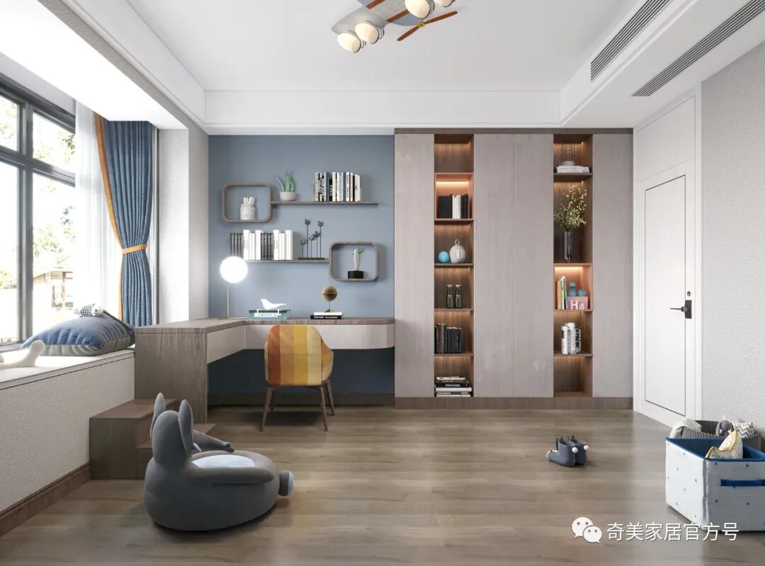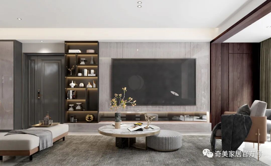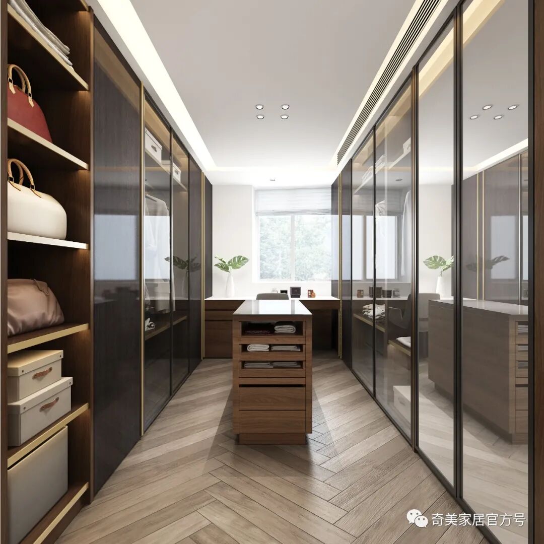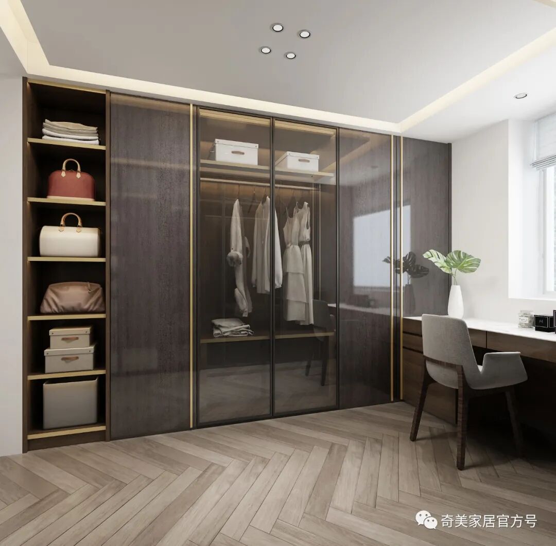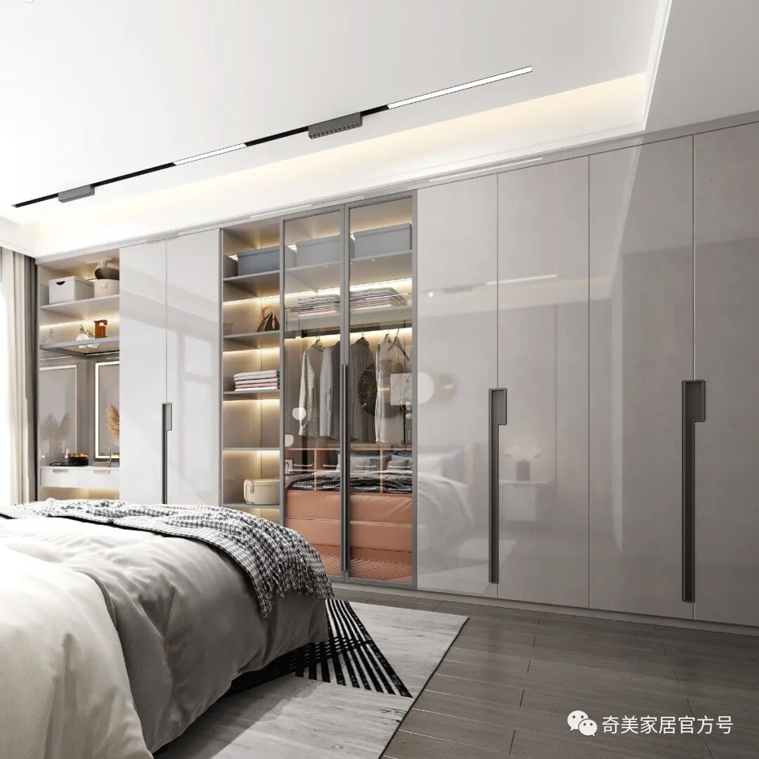 科里斯印象 采用不同的灰阶在空间深浅交替,冷暖穿梭,交汇铺陈出独特高级的韵律美,灯光的考究和软装的精心布置散发奢华魅力,灰调简约风格与灯饰经过大胆谨慎的搭配赋予空间不一样的轻奢格调。沙发背景墙利用大面积的护墙板平铺设计,科里斯灰+酷黑的搭配,大气沉稳,在合适的位置镶嵌一些长短不一的灯带,高档且不显单调。电视墙做为客厅的视觉中心,设计师崇尚“去繁从简”,不做繁复的修饰与设计。以科里斯灰+阿拉尔橡木护墙板平铺为主,科里斯棕开放格为辅,衬托出材质色彩的碰撞。在拥有强大储物空间的同时,也让电视背景墙变得实用、美观。通顶式封闭+开放柜的设计是餐边柜的热门选择,不仅有拉伸空间的效果,而且让展示的效果更加高级。厨房采用玻璃隔断将空间分割,让中厨和西厨空间区分更清晰,这样设计一方面弥补中厨空间储物的不足,另一方面也可让油烟与西餐分离。科里斯灰与天鹅白做搭配,黑色J18条形拉手做点缀,让线条和色彩简洁而不缺趣味,让空间通透且干净。抛弃传统的木门衣柜,用科里斯灰门板+黑框玻璃门配合灯带,让人有一种精致、梦幻的高级感,衣橱里的衣服就如展示品一般,让人赏心悦目。这样的衣柜,不仅仅是一件家具,更是一件装饰品,让卧室看起来更时尚前沿。科里斯灰+阿拉尔橡木,营造出一个简约、自然舒适的儿童空间。书桌、隔板书架和衣柜的合理布局,在满足日常收纳需求外,也给活泼好动的孩子更多活动空间。儿童房另一侧是兼顾两个孩子休息、储物及玩乐的空间,将并排放的半高床合理规划,上休息下储物,毫无压力。床上方便休息,而床下则是小朋友们不可缺少能互动探索的趣味空间。书柜采用嵌入式设计,与空间形成统一,开放式储物格搭配掩门收纳,让使用者在工作时不会产生封闭感,更便于打开思维。深色开放格与封闭柜的组合,让衣帽间自带高级感和时尚感。质感透明的黑框玻璃门,让衣物明朗地呈现在眼前,减少翻找的不便。搭配美轮美奂的灯光效果,轻奢范儿自然流露,给人一种精致高雅的生活氛围。卫生间吊柜采用开放格+镜柜的组合,除了方便主人用来梳妆以外,还可满足更多收纳需求。将地柜悬挂设计,不仅节省空间,还易于打理、清除卫生死角。