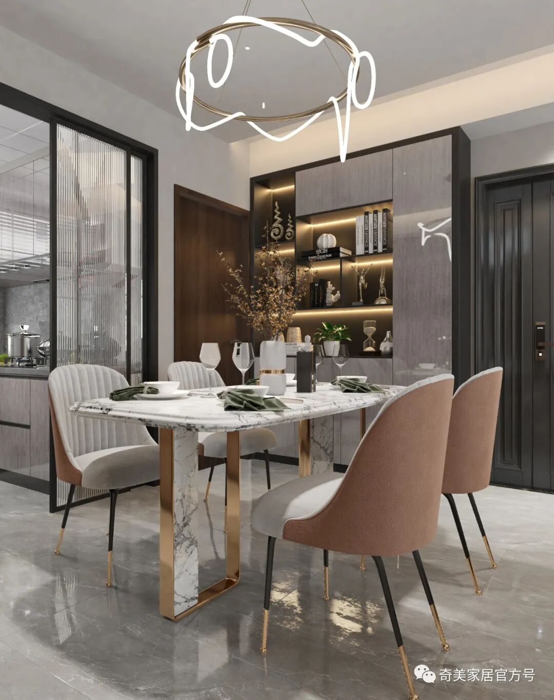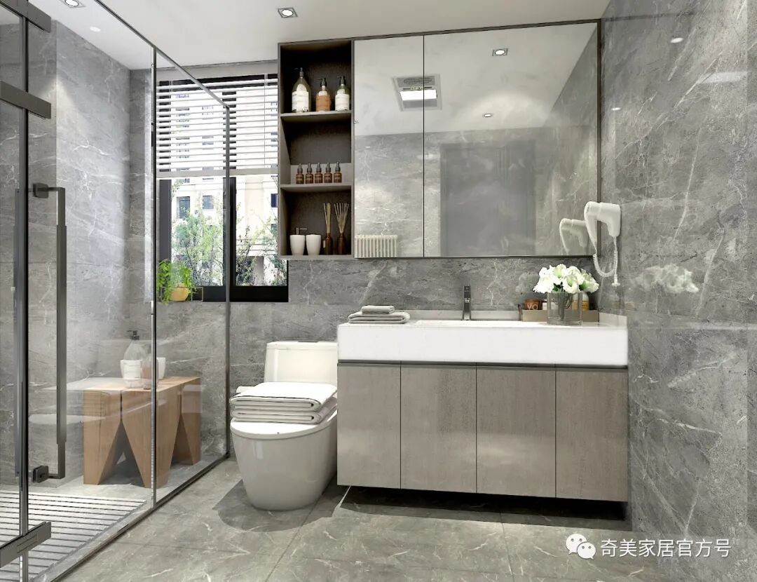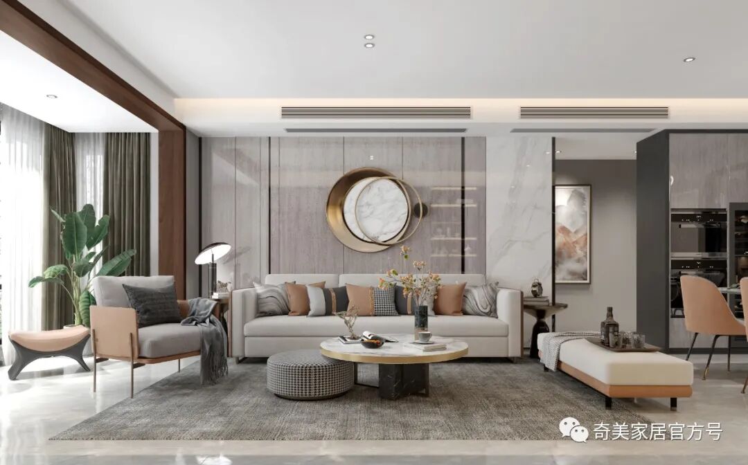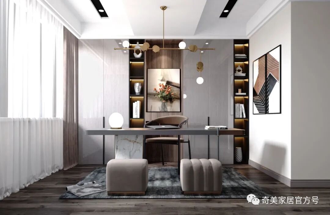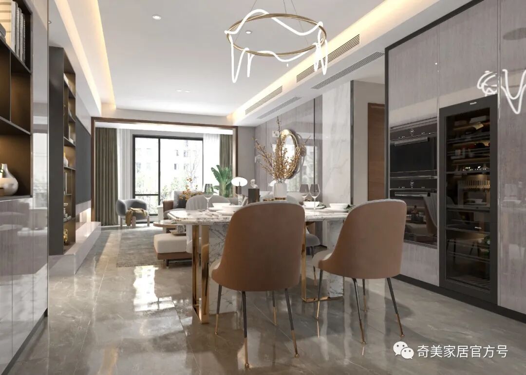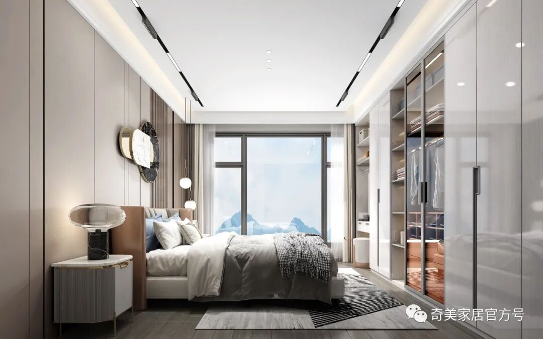 科里斯印象 采用不同的灰阶在空间深浅交替,冷暖穿梭,交汇铺陈出独特高级的韵律美,灯光的考究和软装的精心布置散发奢华魅力,灰调简约风格与灯饰经过大胆谨慎的搭配赋予空间不一样的轻奢格调。沙发背景墙利用大面积的护墙板平铺设计,科里斯灰+酷黑的搭配,大气沉稳,在合适的位置镶嵌一些长短不一的灯带,高档且不显单调。电视墙做为客厅的视觉中心,设计师崇尚“去繁从简”,不做繁复的修饰与设计。以科里斯灰+阿拉尔橡木护墙板平铺为主,科里斯棕开放格为辅,衬托出材质色彩的碰撞。在拥有强大储物空间的同时,也让电视背景墙变得实用、美观。通顶式封闭+开放柜的设计是餐边柜的热门选择,不仅有拉伸空间的效果,而且让展示的效果更加高级。厨房采用玻璃隔断将空间分割,让中厨和西厨空间区分更清晰,这样设计一方面弥补中厨空间储物的不足,另一方面也可让油烟与西餐分离。科里斯灰与天鹅白做搭配,黑色J18条形拉手做点缀,让线条和色彩简洁而不缺趣味,让空间通透且干净。抛弃传统的木门衣柜,用科里斯灰门板+黑框玻璃门配合灯带,让人有一种精致、梦幻的高级感,衣橱里的衣服就如展示品一般,让人赏心悦目。这样的衣柜,不仅仅是一件家具,更是一件装饰品,让卧室看起来更时尚前沿。科里斯灰+阿拉尔橡木,营造出一个简约、自然舒适的儿童空间。书桌、隔板书架和衣柜的合理布局,在满足日常收纳需求外,也给活泼好动的孩子更多活动空间。儿童房另一侧是兼顾两个孩子休息、储物及玩乐的空间,将并排放的半高床合理规划,上休息下储物,毫无压力。床上方便休息,而床下则是小朋友们不可缺少能互动探索的趣味空间。书柜采用嵌入式设计,与空间形成统一,开放式储物格搭配掩门收纳,让使用者在工作时不会产生封闭感,更便于打开思维。深色开放格与封闭柜的组合,让衣帽间自带高级感和时尚感。质感透明的黑框玻璃门,让衣物明朗地呈现在眼前,减少翻找的不便。搭配美轮美奂的灯光效果,轻奢范儿自然流露,给人一种精致高雅的生活氛围。卫生间吊柜采用开放格+镜柜的组合,除了方便主人用来梳妆以外,还可满足更多收纳需求。将地柜悬挂设计,不仅节省空间,还易于打理、清除卫生死角。